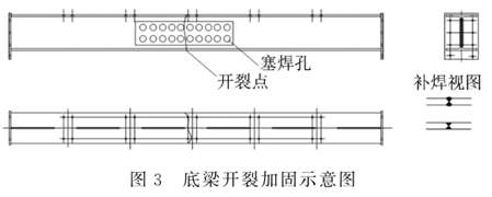 底梁主要在中間部位容易開裂,采用打坡口、焊接平,再加副板的方法解決,通過塞焊和斷續(xù)焊接把副板和底梁固定在一起,能達到預(yù)期目的,延長使用壽命。