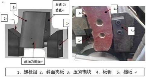 采用楔塊將板錘固定在轉(zhuǎn)子上,工作中在離心力作用下,這種方式能保證轉(zhuǎn)子速度越快,板錘固定越牢,而且工作可靠,拆換比較方便。這是板錘目前較好的一種固定方式。