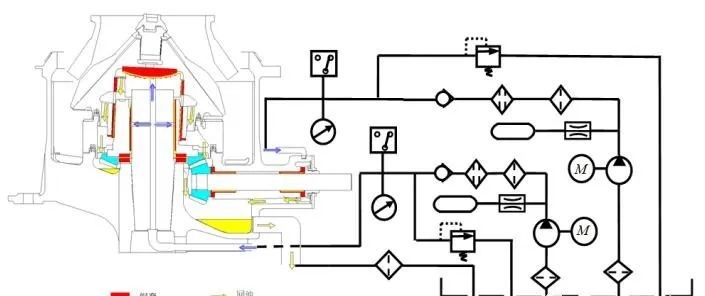 從圓錐破碎機(jī)的結(jié)構(gòu)和潤滑油流動線路中可以看出,它潤滑部位主要包括: